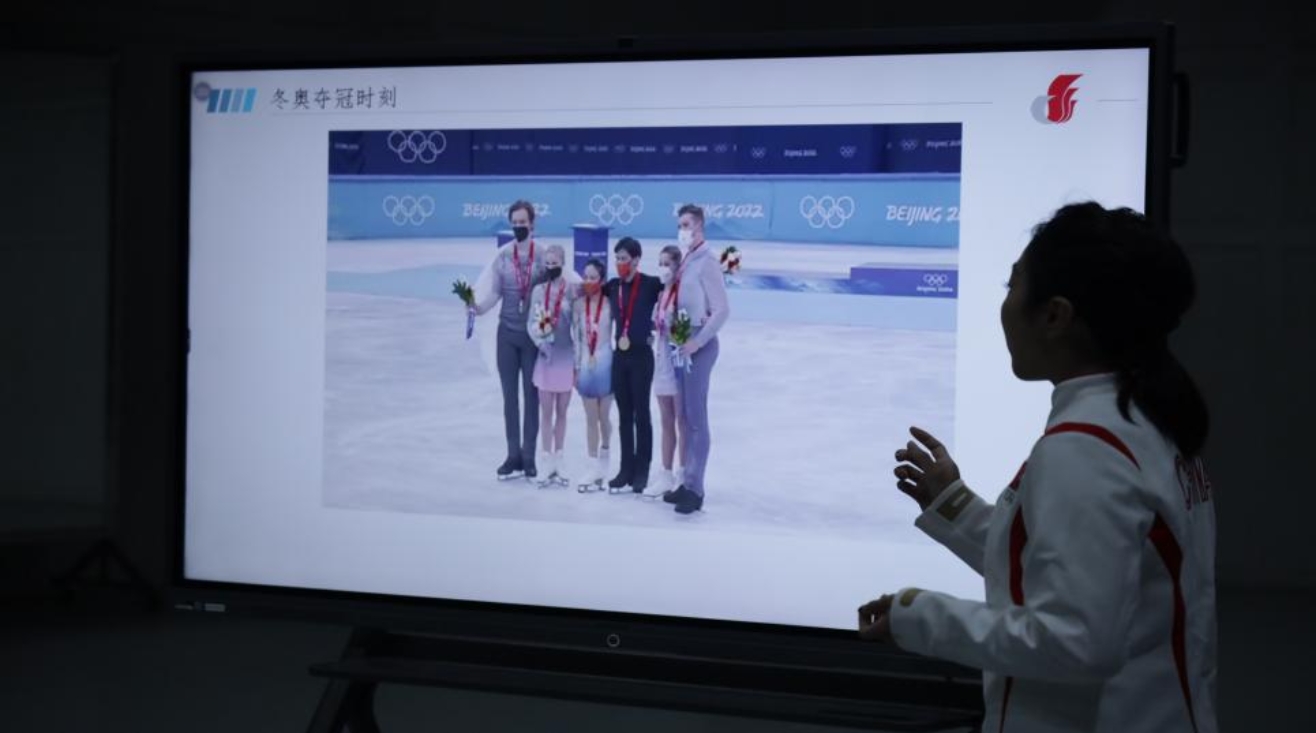 隋文静通过分享冬奥夺冠的精彩时刻,回顾了她和舞伴共同获得第九金的来之不易,冬奥赛场的第九金对于中国来说意义重大。隋文静讲述时溢于言表的自信与自豪让全体师生仿佛亲临了那个激动人心的紧张时刻,掌声时时响起,激励着同学们努力奋进,以舞报国的使命担当。